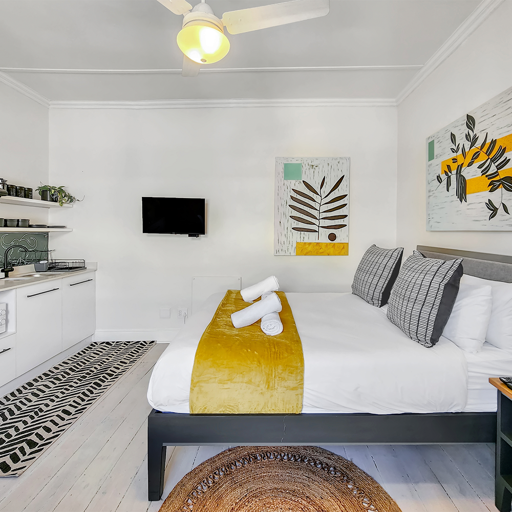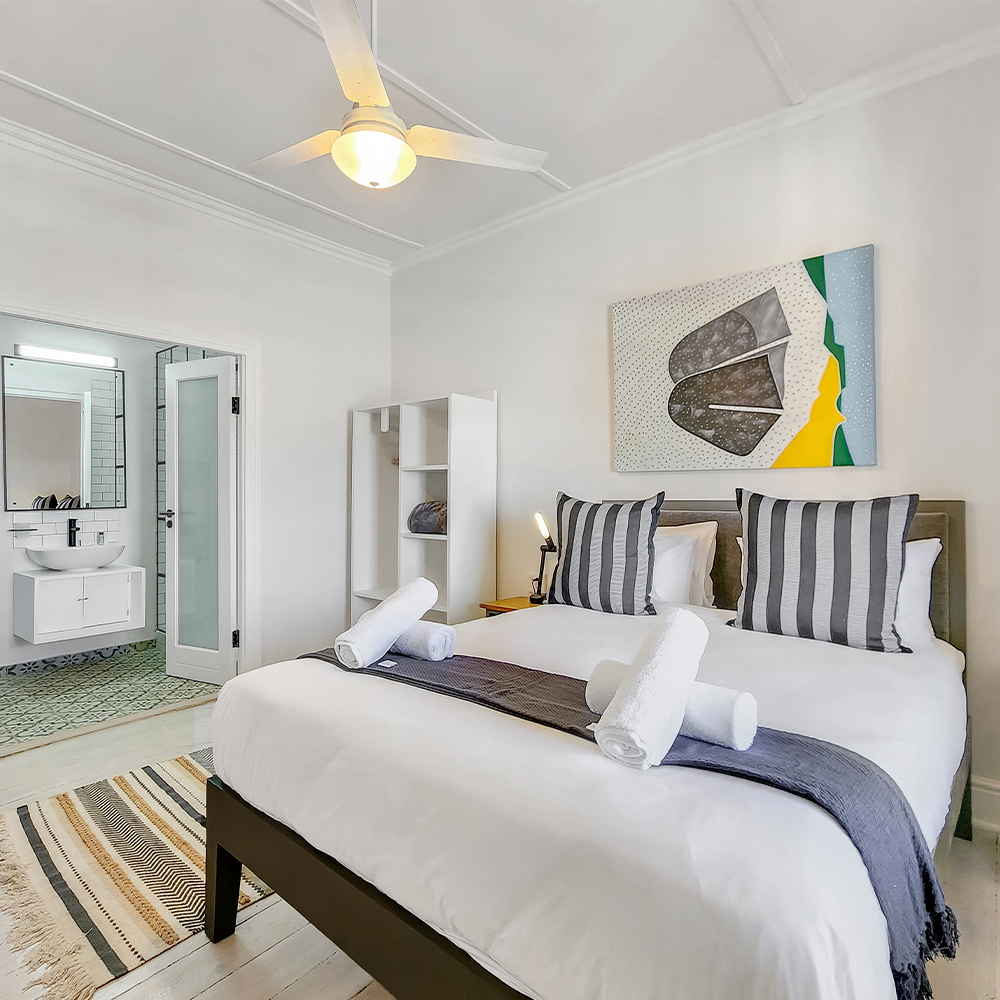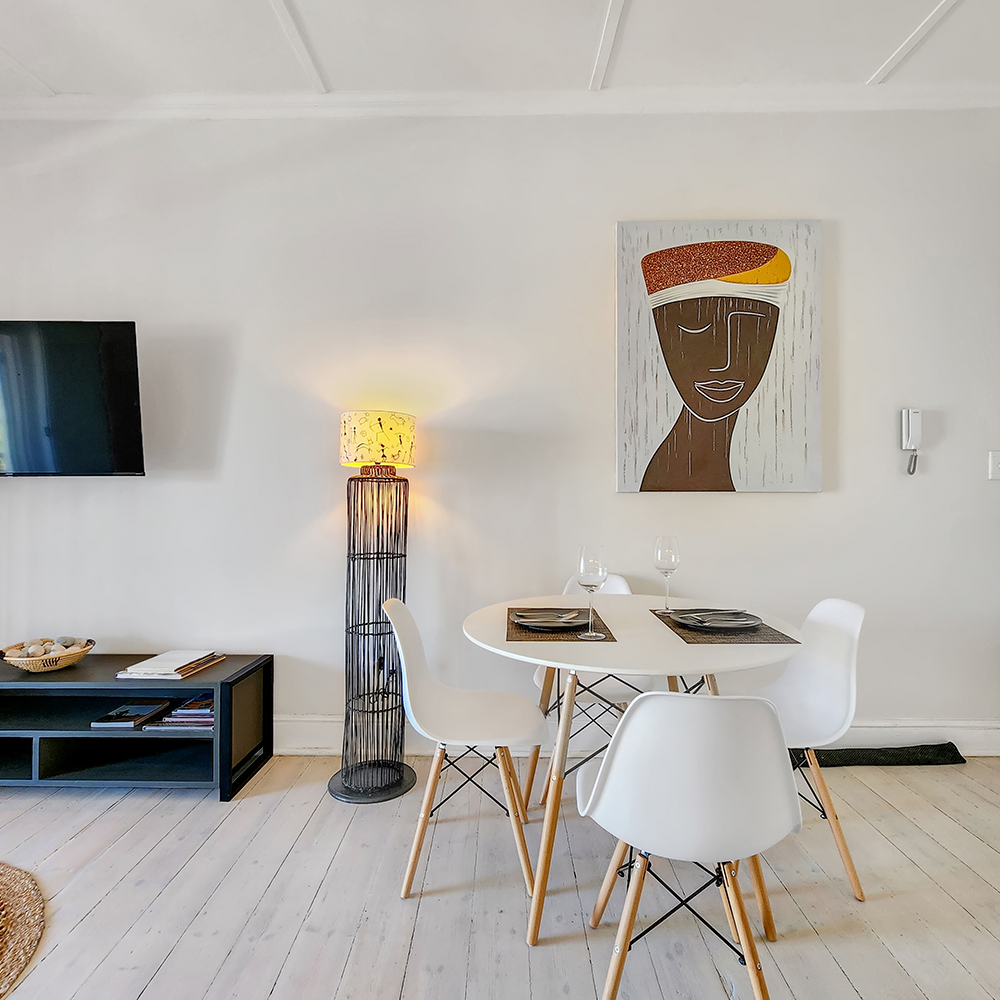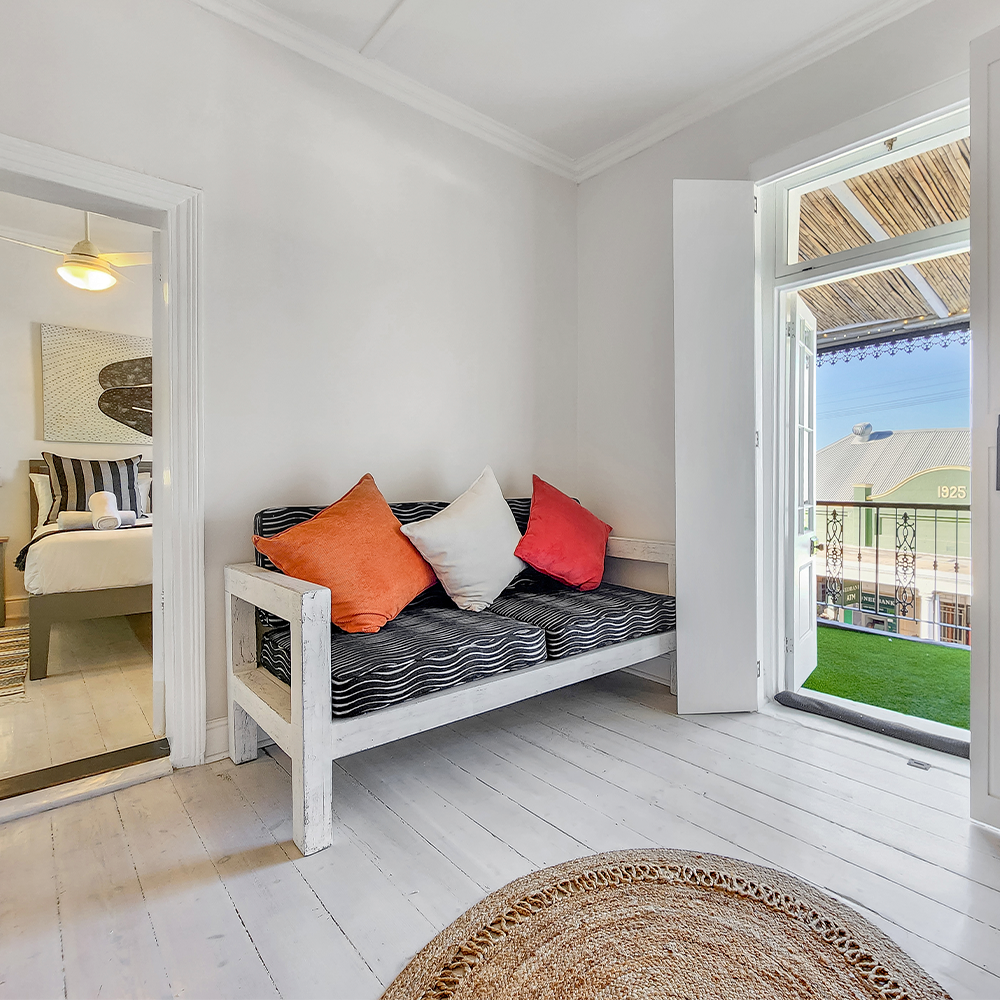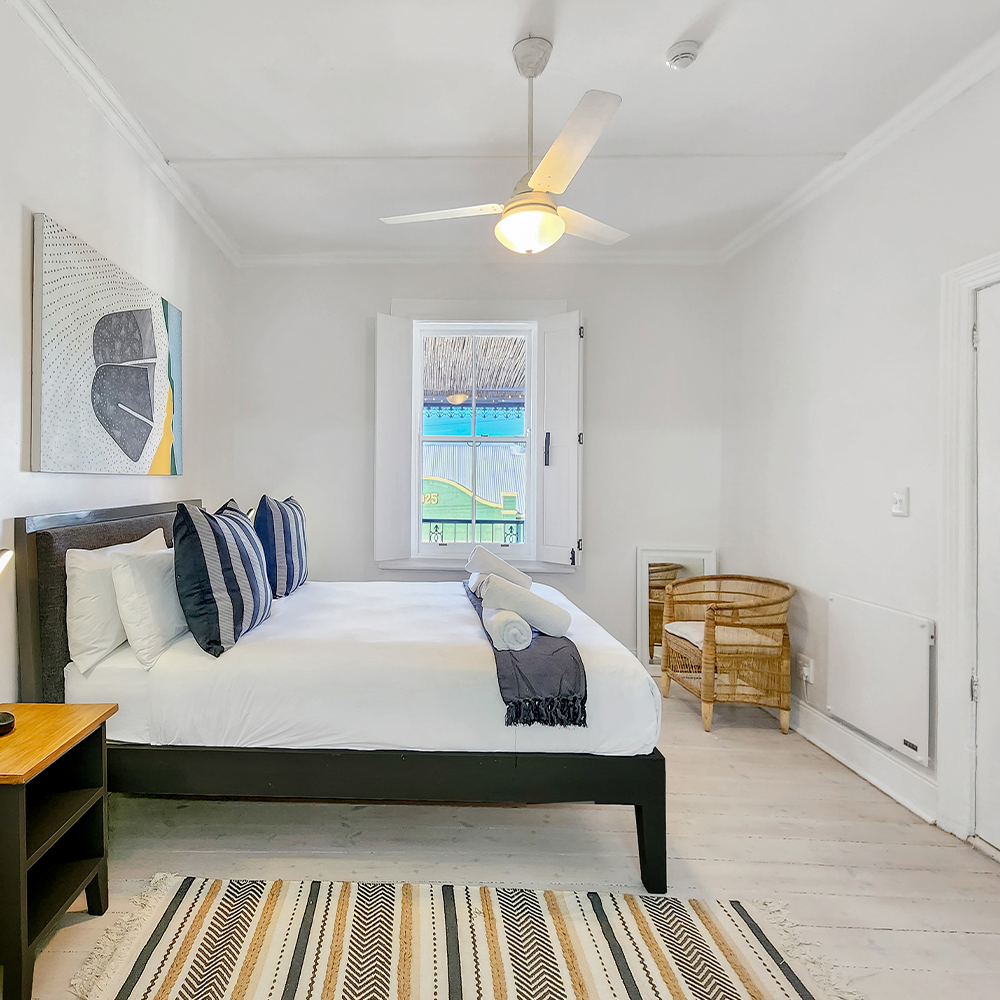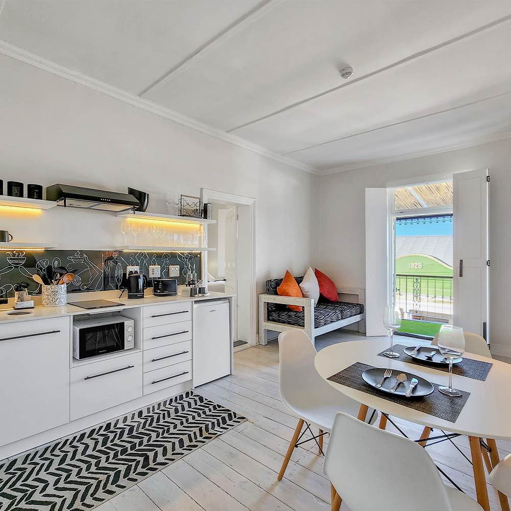 The apartment offers an open plan dining area and kitchen with ceiling fan leading to a cosy private covered balcony, comfortably furnished and ideal for entertaining, or that morning coffee or late afternoon sundowner watching the world go by below. Very light and airy and exuding style and class, this apartment provides guests with a comfortable and enchanting experience.