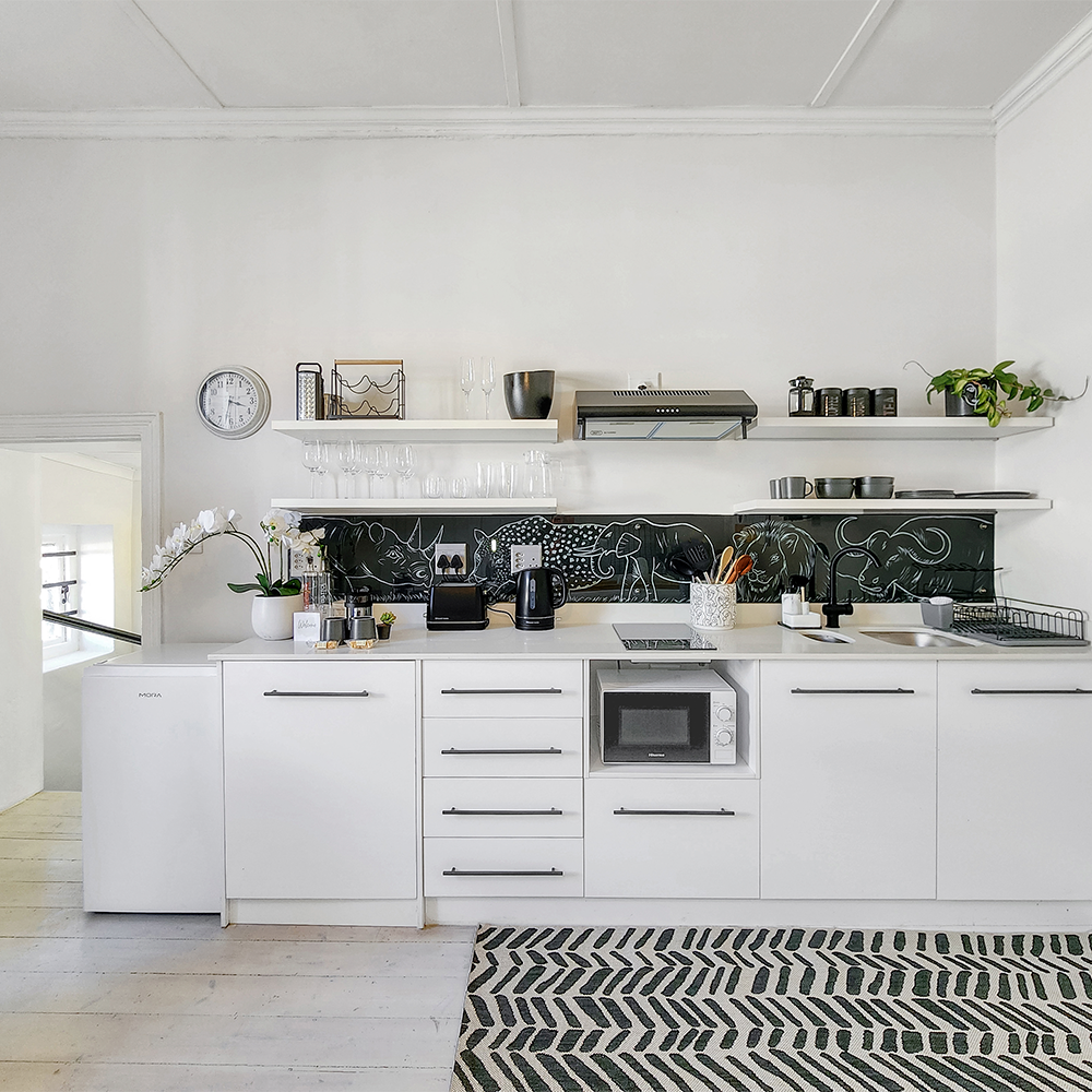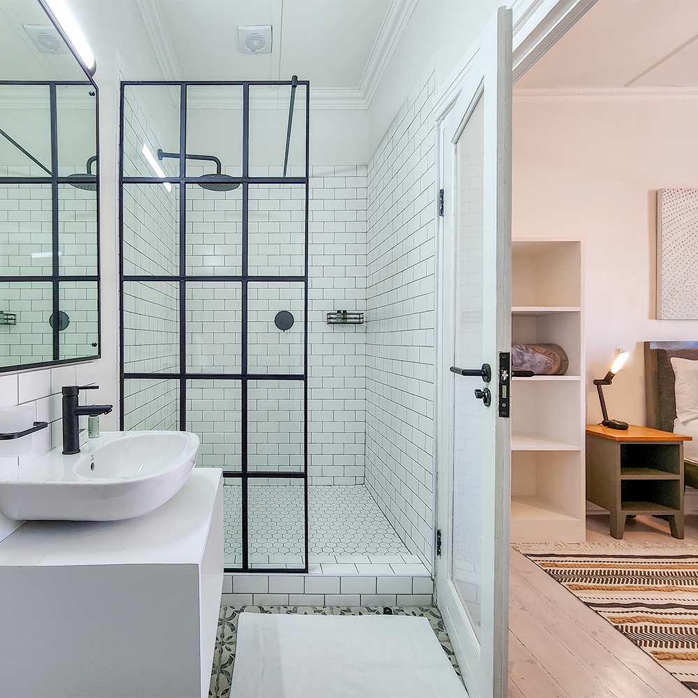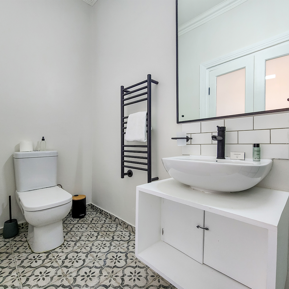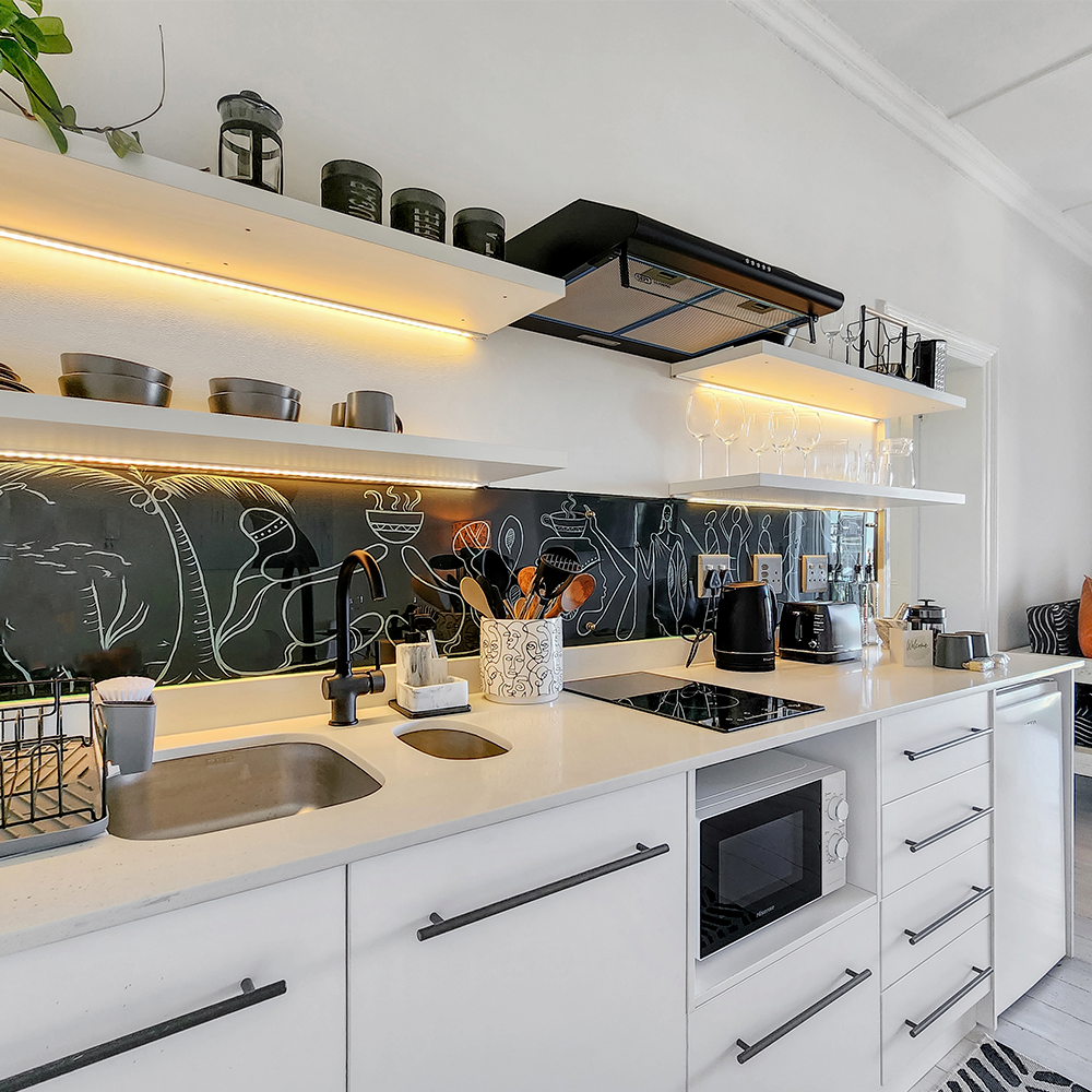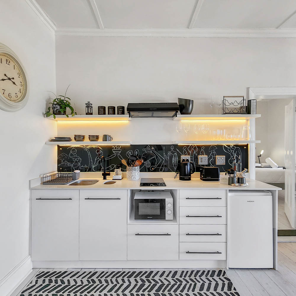 The bedroom is ensuite with an exquisite bathroom with shower and heated towel rail. The bed is a Queen Extra Length with hotel quality linen. The fully equipped kitchen comes with all utensils, 2 ring hob and extractor, bar fridge, microwave, and back up gas hob, if necessary. A smart TV provides access to Netflix and YouTube etc, and the electrical power back up ensures all the common areas are lit, and the hi-speed Wi-Fi and TVs are always available.