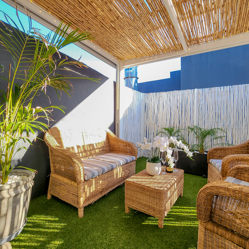 The living area leads to a delightful and cosy covered garden patio, comfortably furnished and ideal for entertaining, or that morning coffee or late afternoon sundowner. A smart TV provides access to Netflix and YouTube etc, and the electrical power back up ensures all the common areas are lit, and the hi-speed Wi-Fi and TVs are always available.